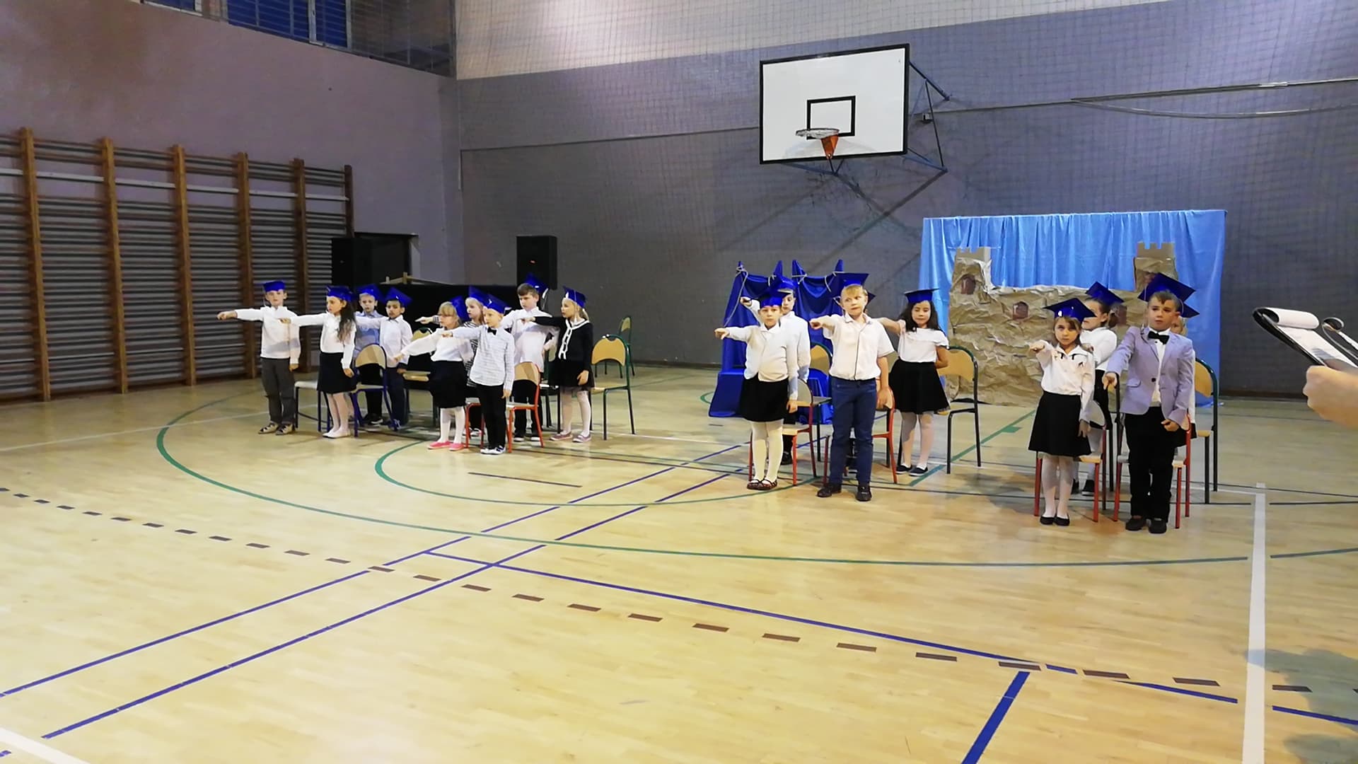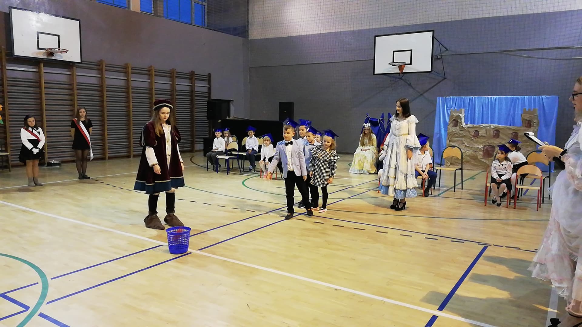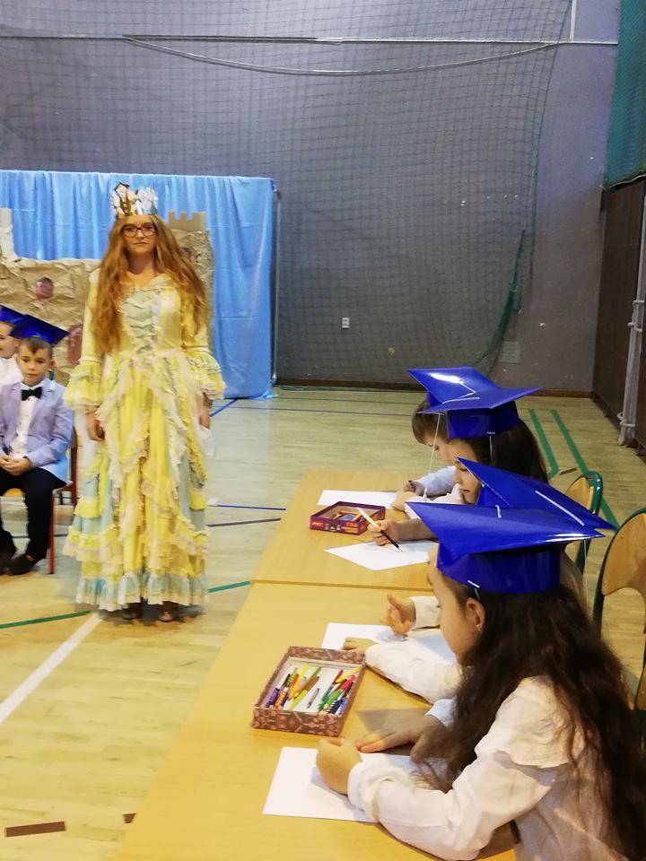 Nasze „maluchy” zostały zaproszone przez gimnazjalistów do Królestwa, w którym panuje król Mikołaj I Rej i jego żona Zofia. Pierwszaki zostały poddane różnym próbom. Dzieci musiały się wykazać umiejętnością narysowania portretu królowej Zofii, sprawnością fizyczną w rzucie do celu, umiejętnością rozpoznawania różnych smaków oraz znajomością historii królestwa. Wszystkie próby zostały zaliczone na „szóstkę”, więc uczniowie klasy I-ej zasłużyli na to, aby stać się pełnoprawnymi członkami społeczności uczniowskiej. Pani Dyrektor piórem pasowała dzieci na uczniów naszej szkoły i wręczyła im dyplomy oraz drobne prezenty.