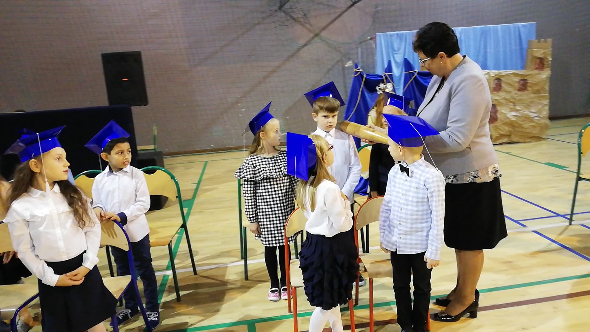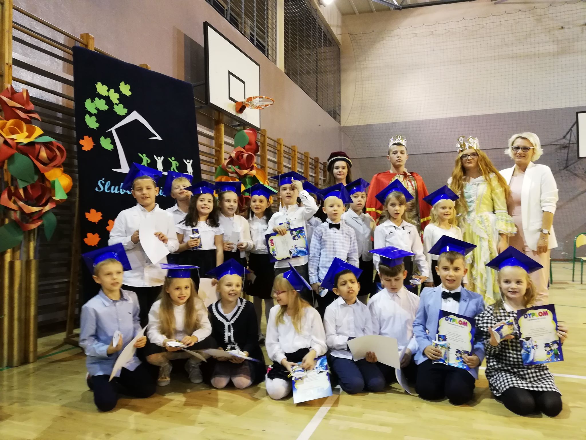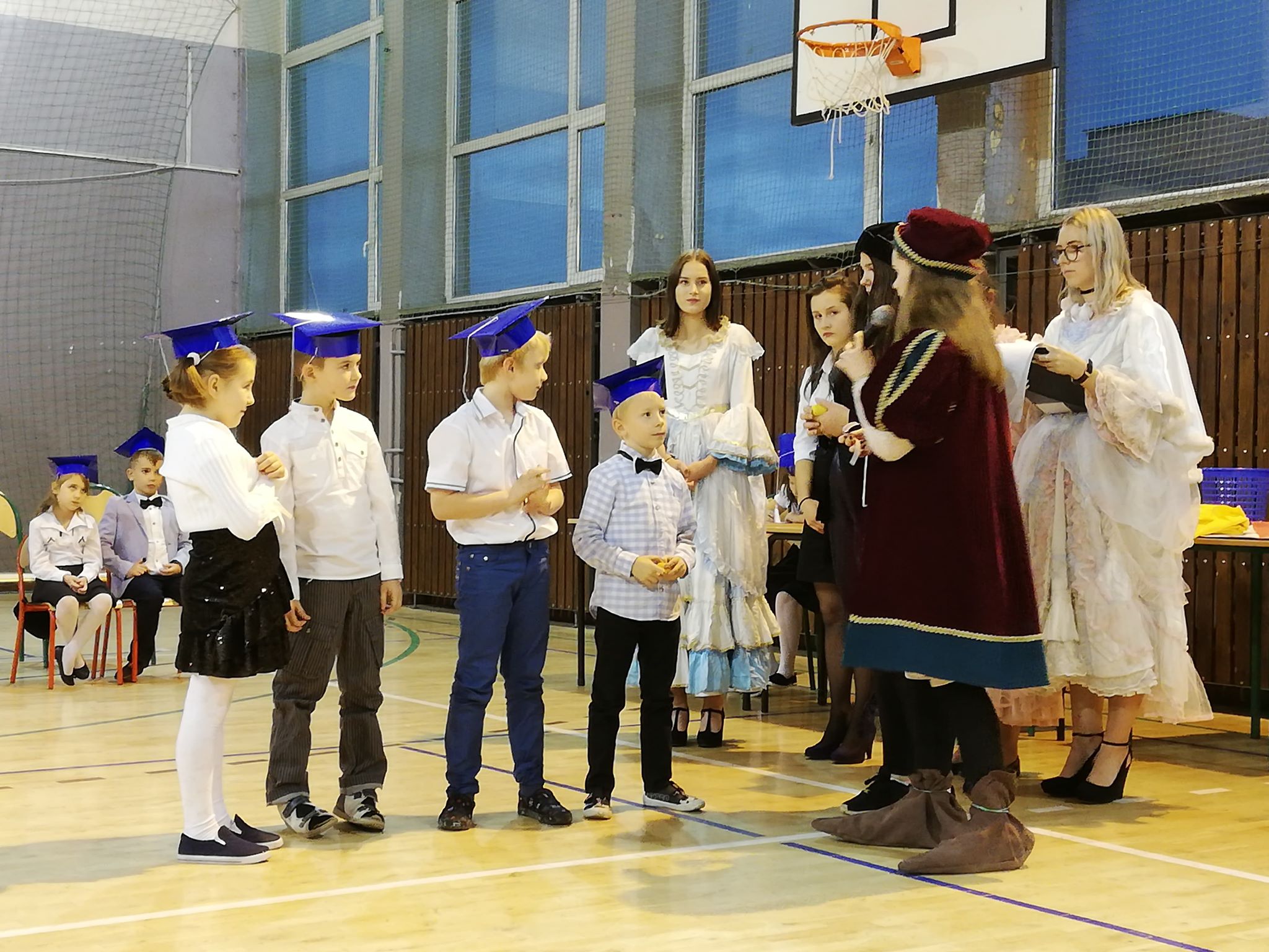 Nasze „maluchy” zostały zaproszone przez gimnazjalistów do Królestwa, w którym panuje król Mikołaj I Rej i jego żona Zofia. Pierwszaki zostały poddane różnym próbom. Dzieci musiały się wykazać umiejętnością narysowania portretu królowej Zofii, sprawnością fizyczną w rzucie do celu, umiejętnością rozpoznawania różnych smaków oraz znajomością historii królestwa. Wszystkie próby zostały zaliczone na „szóstkę”, więc uczniowie klasy I-ej zasłużyli na to, aby stać się pełnoprawnymi członkami społeczności uczniowskiej. Pani Dyrektor piórem pasowała dzieci na uczniów naszej szkoły i wręczyła im dyplomy oraz drobne prezenty.